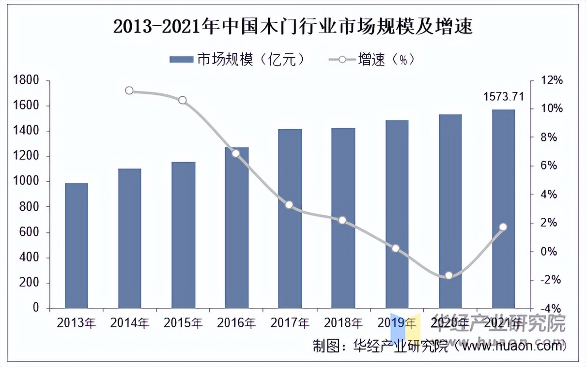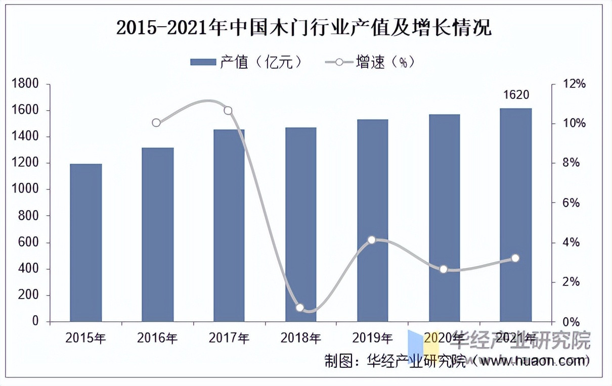 木质门是建筑中应用最早的产品之一,也是现代家居和房屋装修的必需品之一。据中国木材与木制品流通协会木门窗专业委员会数据,我国木门行业产值自2015年的1200亿元增至2021年的1620亿元,期间年均复合增速为5.13%。