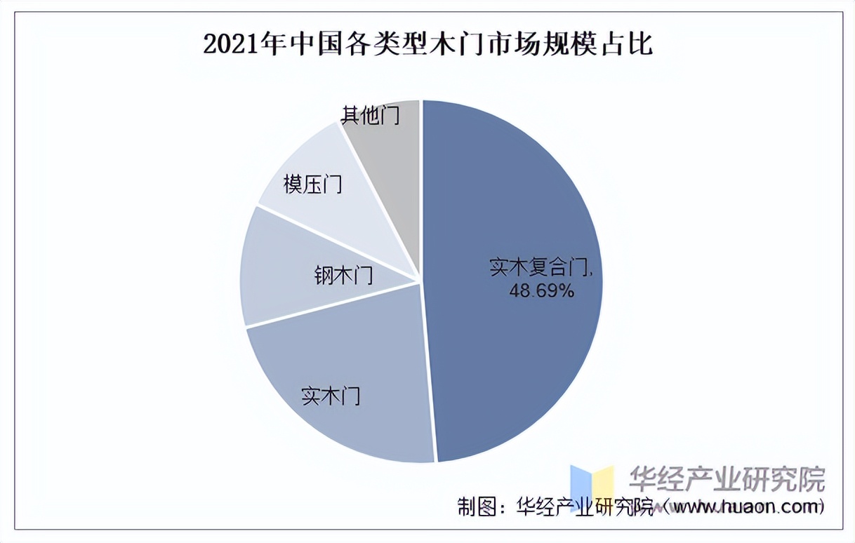 木门种类多样,木门主要可分为实木复合门、实木门、钢木门、模压门等,目前我国木门行业主要以实木复合门为主,2021年实木复合门占木门行业市场规模比重的48.69%,其次是实木门,占比22.23%。