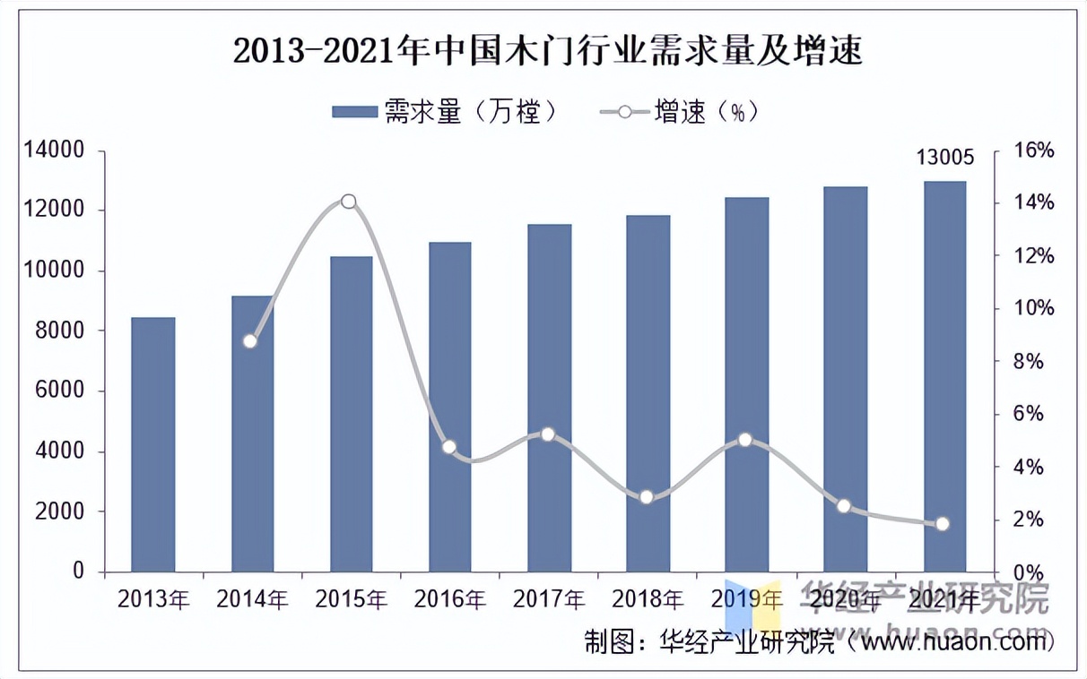 木门行业近10年来发展迅猛,其快速发展主要来自于商品房精装修市场、已住房二次装修市场、保障房工程和自建房市场以及出口的需求等方面。近几年国内房地产宏观调控趋严的态势下,木门需求增速有所放缓,2021年我国木门需求数量为13005万樘,较2020年增加222万樘,同比增长1.74%。
